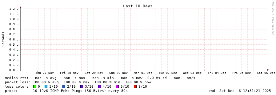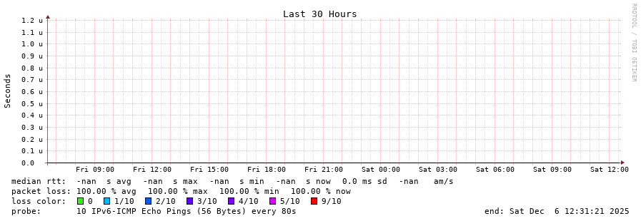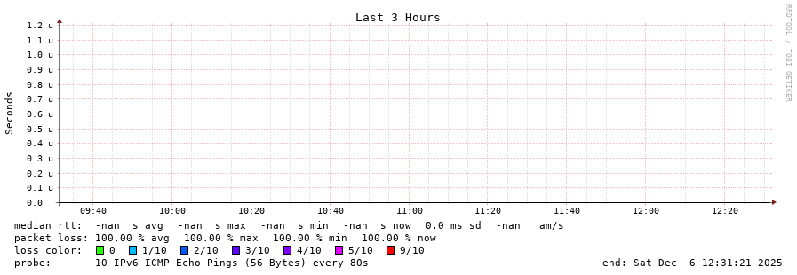 traceroute to fd69:226f:3a3c::2 (fd69:226f:3a3c::2), 30 hops max, 80 byte packets - Generated at 2025-12-06 12:15:01 3 > 4 > 5 > 6 > 7 > 8 > 9 > 10 > 11 > 12 > 13 > 14 > 15 > 16 > 17 > 18 > 19 > 20 > 21 > 22 > 23 > 24 > 25 > 26 > 27 > 28 > 29 > 30 >